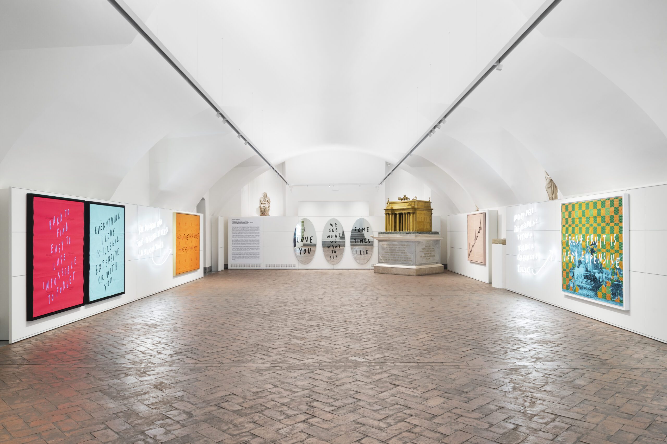 ‘This exhibition is a true journey into the soul of Milan, a city pulsating with life, creativity and culture. Pietro Terzini, with his unique style, invites us to discover a world of works on paper, neon and mirrors, where words are the absolute protagonists. But that’s not all: alongside the texts are iconic figurative elements, true tributes to Milan and the Ambrosiana (the first library open to the public in Europe and the oldest museum in Milan), including Caravaggio’s Canestra and the Madonnina, which take us into a profound dialogue between memory and contemporaneity and inevitably to a comparison between the present and the past, between classical iconography and