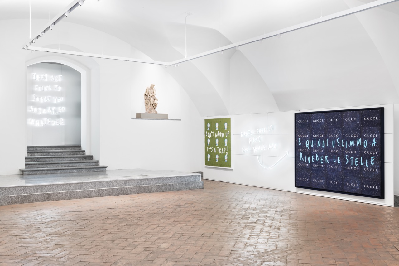 The themes addressed throughout the exhibition range from love to personal fulfilment, from the tension between materiality and spirituality, to the central theme of the entire exhibition: the judgement of others. Through direct, ironic and provocative phrases,